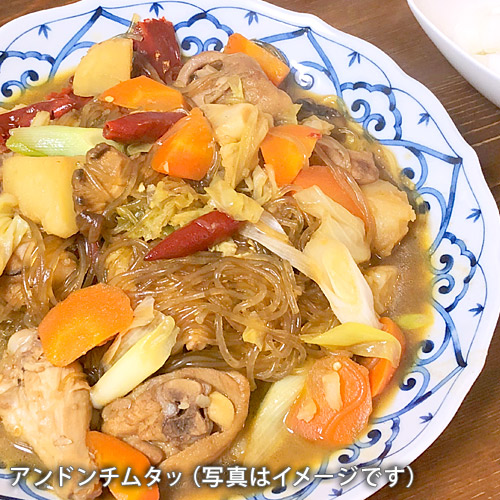 | メニュー | ◯アンドンチムタッ(韓国安東の名物料理、鶏肉を使った甘辛炒め物) ◯大根の酢漬け(辛いお料理、揚げ物の定番付け合せ) ◯大豆粉を使ったほうれん草ナムル(大豆粉の香ばしさが美味しいヘルシーナムル) ◯大根と干し柿の和えもの(干し柿の甘さが引き立つ、上品な和えもの) ![]() |